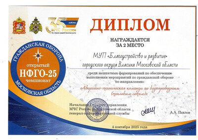 4 сентября 2025 года проводился открытый чемпионат НФГО-25. МУП «Благоустройство и развитие» городского округа Власиха приняло участие в чемпионате и заняло 2 место среди нештатных формирований по обеспечению выполнения мероприятий по гражданской обороне по направлению «Аварийно – техническая команда по водопроводным (тепловым сетям)»